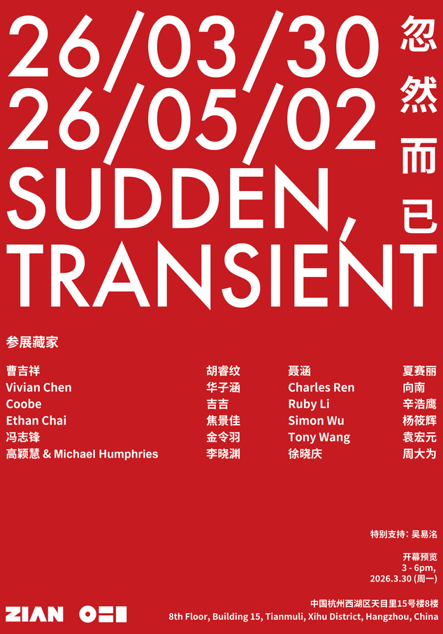 ZIAN Gallery is pleased to announce its second Hangzhou location at Tianmuli. The inaugural exhibition, "Sudden, Transient," presents a curated selection of works from 25 prominent collectors active in the contemporary landscape. Drawing from their systematic acquisitions of recent years, the show offers a microscopic examination of time, existence, and materiality.